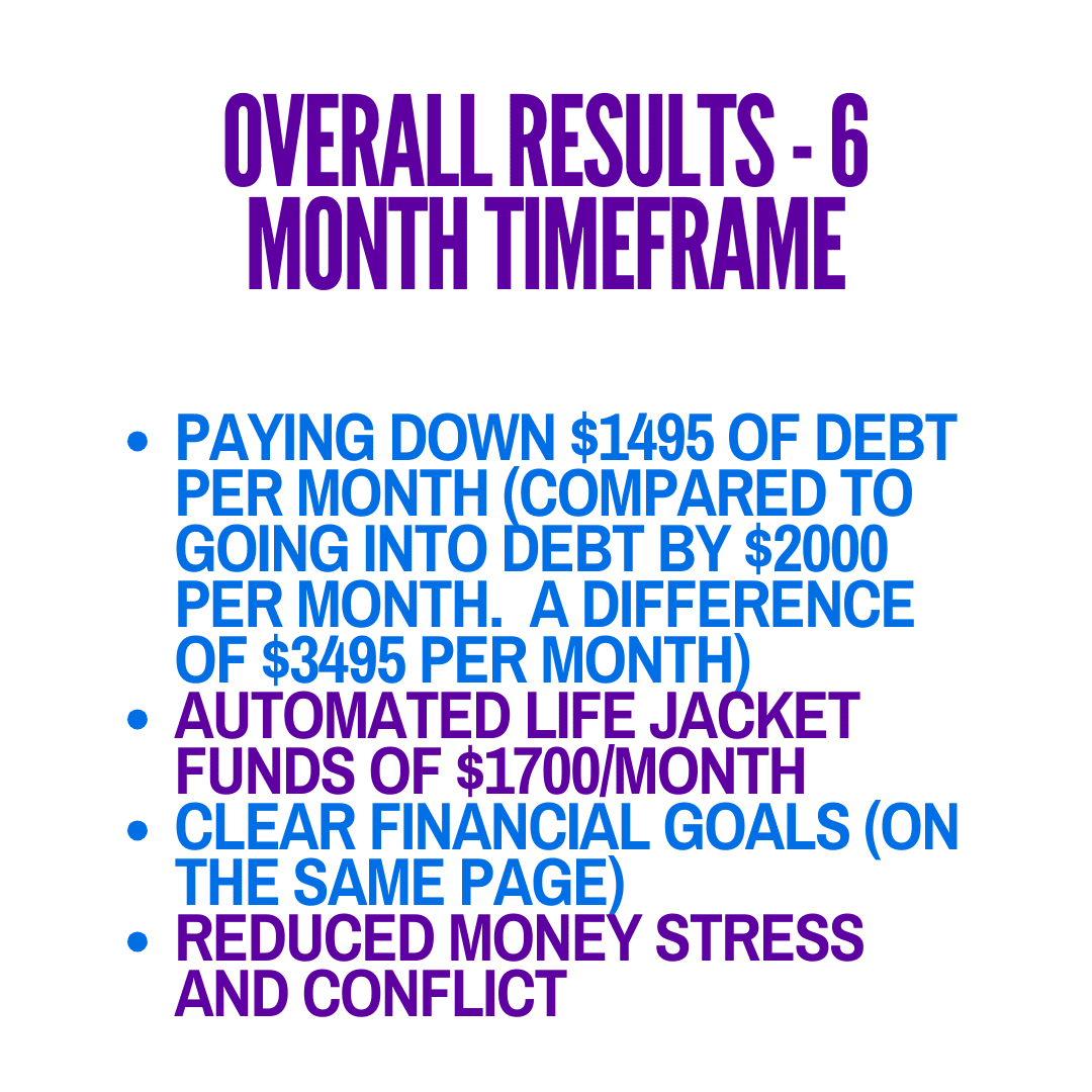 Hey Reader! The first quarter of 2024 is done and dusted, and I wanted to share with you some outstanding results one of my couple client's can brag about! Erin and Tom (100% fake names), approached me feeling like they were living “paycheck to paycheck” with no plan for their substantial income. They were going in the hole to the tune of approx. $2000 per month and didn’t understand why due to their middle incomes. They had tried to get on the same page with money, but could never stick to the budgets and budgeting apps they had tried. They felt defeated, frustrated, and stressed. After our complimentary discovery call, we decided that the Money Fix Pro would be a great fit for their needs and they committed themselves to the program. By the end of working together over a 6 month period, they were following an anti-budget plan that allowed them to stop going in the hole by $2000 per month, and additionally pay down $1495 per month on their debts. (That's a net cashflow GAIN of $3495 per month). Not only that, but we automated $1700 per month into their lifejacket funds for upcoming expenses (kid's activities, Christmas, vacation, house and car repairs and emergency expenses.) They had not been saving anything for these previously. I'm an open book, so let's take a look at EXACTLY how they did it⬇️⬇️⬇️ The Facts